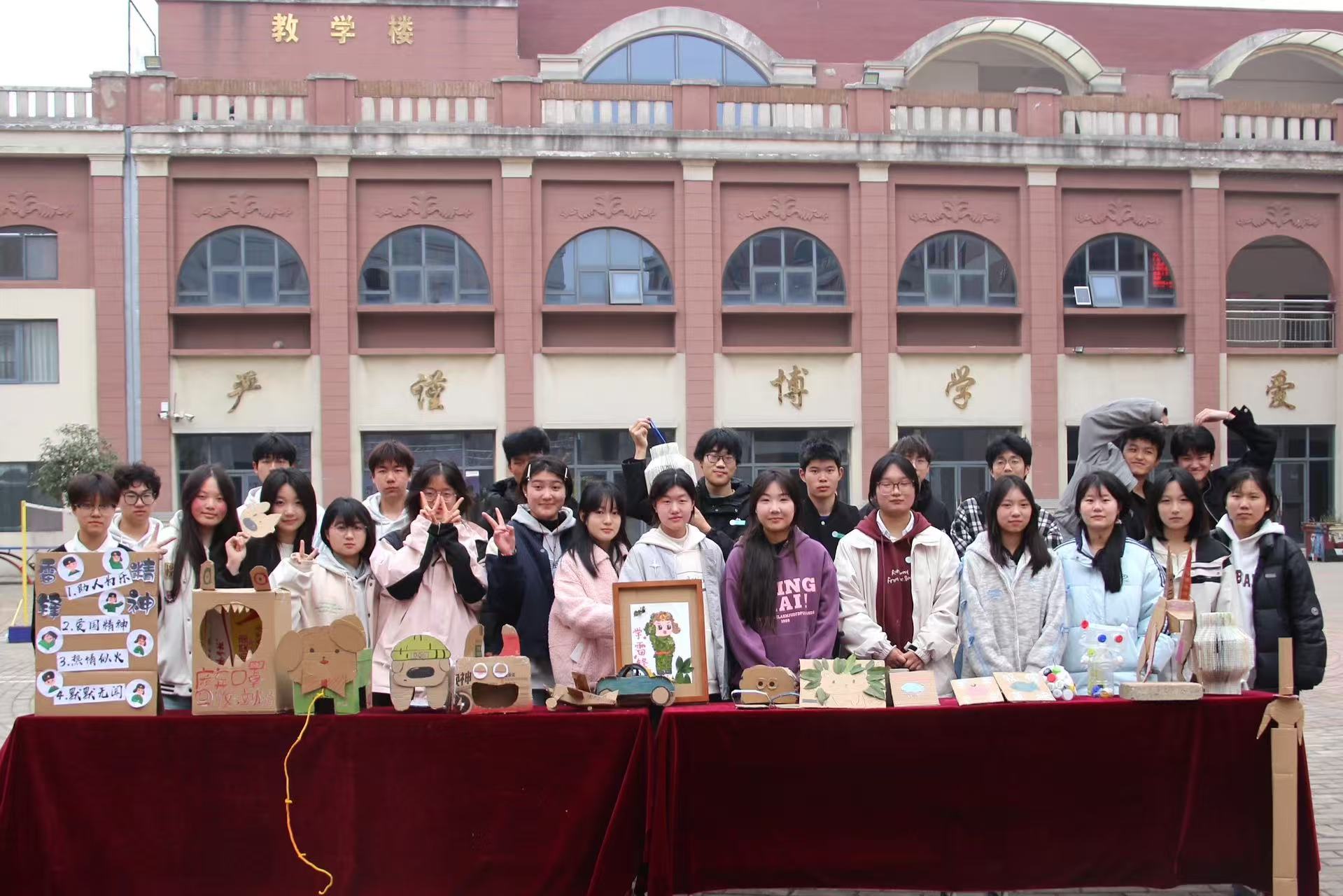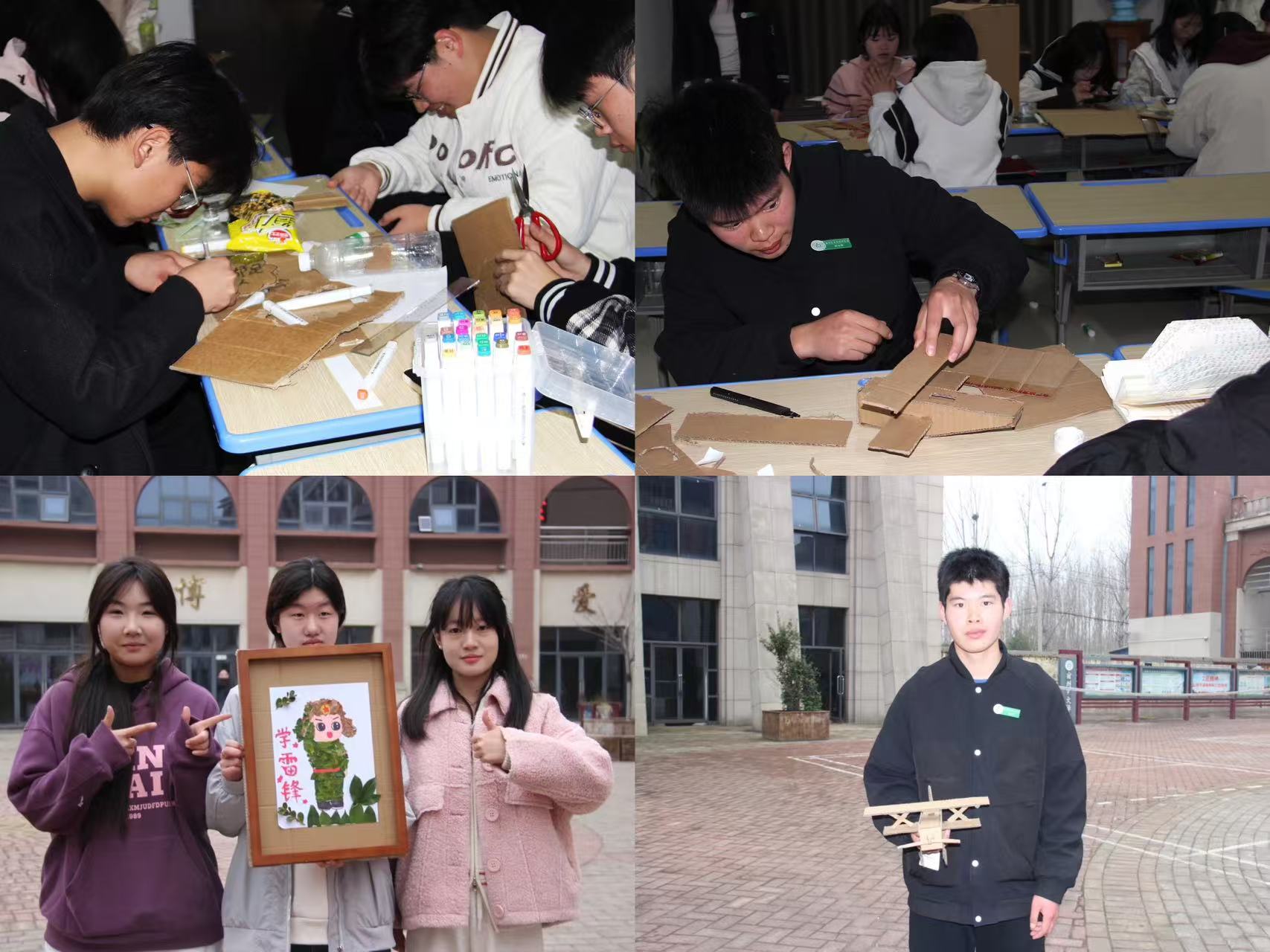 依托學(xué)校“藝術(shù)育人”特色,學(xué)生科組織美術(shù)、設(shè)計、社會文化與藝術(shù)等專業(yè)學(xué)生,將清理出的廢舊紙箱、塑料瓶等材料“變廢為藝”,創(chuàng)作了多組裝置藝術(shù)作品。這些作品陳列于教學(xué)樓走廊、文化廣場等公共區(qū)域,將雷鋒精神具象化為可視化的藝術(shù)語言。